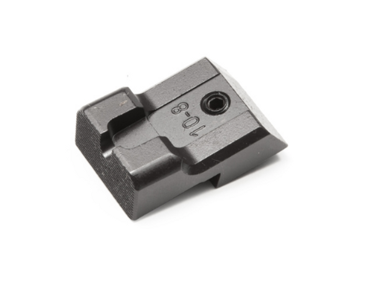 The 10-8 Performance rear sight is precision CNC machined from heat treated 4140 bar stock to better resist the nicking and denting that is typical with the wear and tear of daily carry. All 10-8 sights feature a U notch for rapid, intuitive alignment with dot such as on our tritium insert and fiber optic front sights. The rear face is serrated at 40 lpi to reduce glare in varied lighting conditions. The sight blade is thick enough to allow setting in tritium vials as dots or bars if one so chooses, but we recommend leaving them without inserts in order to draw the eye toward the front sight. The sight body is contoured and dehorned for comfortable handling and carry. All rear sights feature a plain black blade finished in matte black oxide.