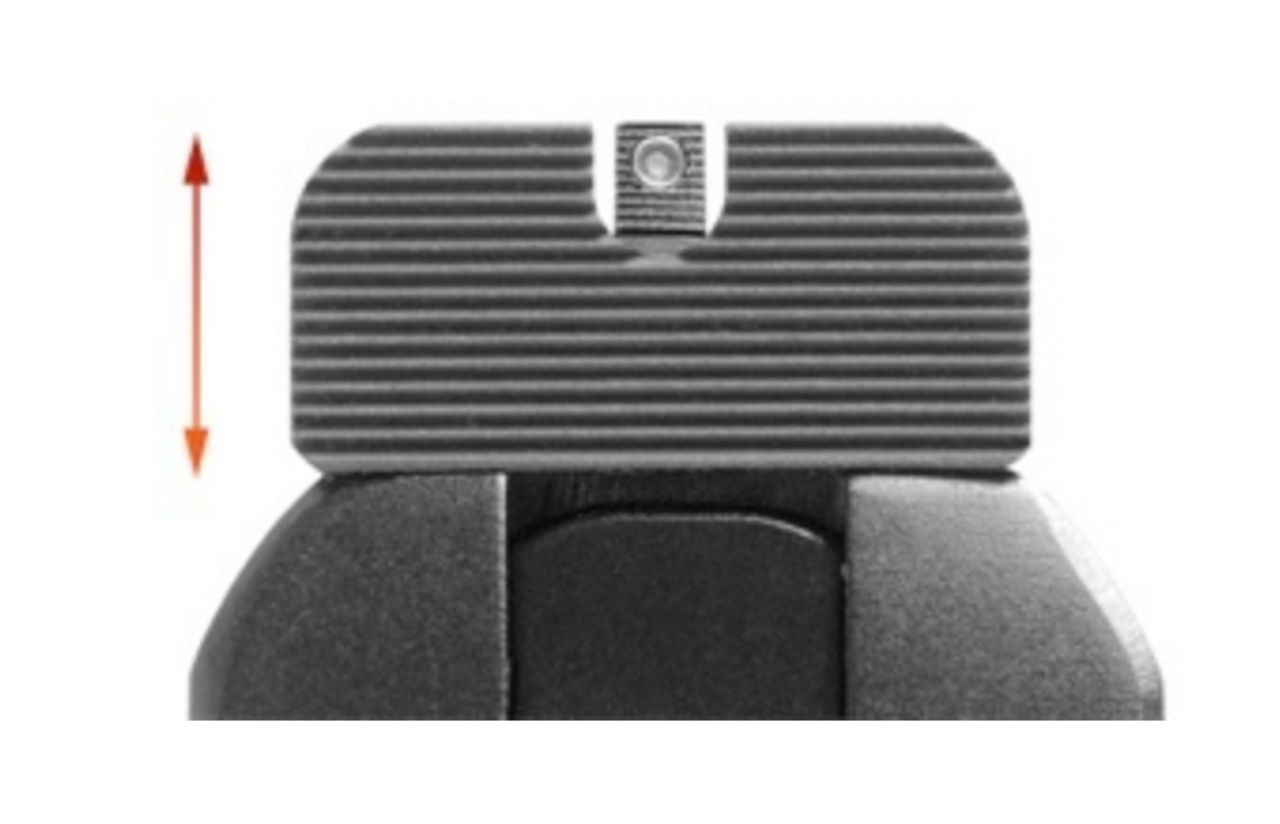 Most factory sight setups feature a rear notch that is the same width as the front blade – ie. typically a .125″ wide rear notch with .125″ wide front sight. This type of setup provides a relatively tight visual window that optimizes precision for maximum accuracy. For most shooters with good vision, this combination works fine. An increasingly popular combination is the .140″ rear notch with a .125″ width front blade. For most shooters, this combination offers improved speed on close range targets without degrading perceived accuracy out to 25 yards. The .156″ extra wide notch is compatible with the XS Standard Dot (.110” width) or XS Big Dot (.161” width) front sights, and also makes for a very quick combination in conjunction with our .125″ wide front sights. Our recommended “signature” set is the .140″ wide rear notch with a .100″ wide fiber optic front, or the .156″ rear with the .125″ brass bead front.