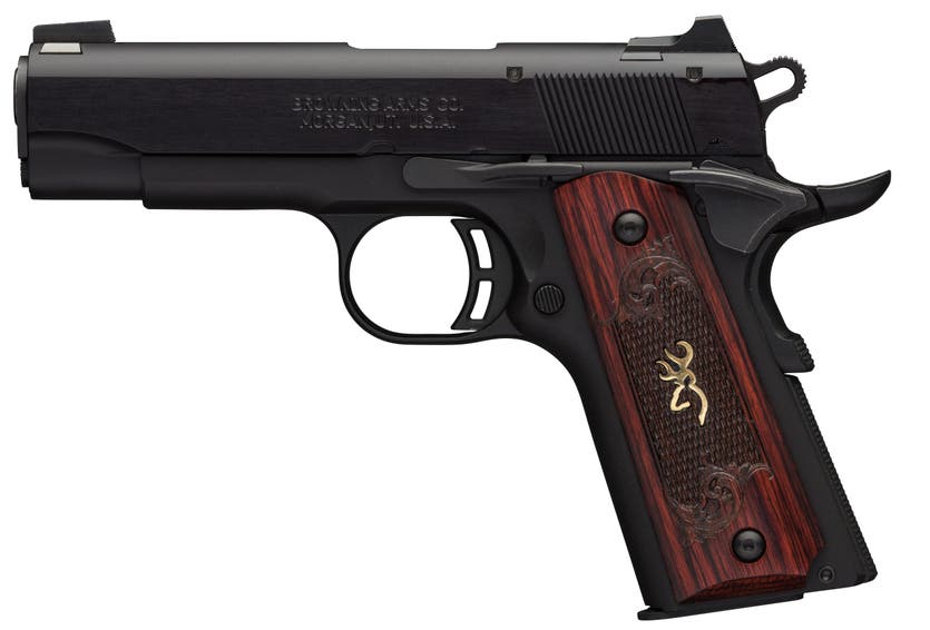 85% scale compact 1911 design. Checkered rosewood grips, gold Buckmark inlay, composite frame, extended beavertail grip safety, three dot sights, skeletonized hammer and trigger.