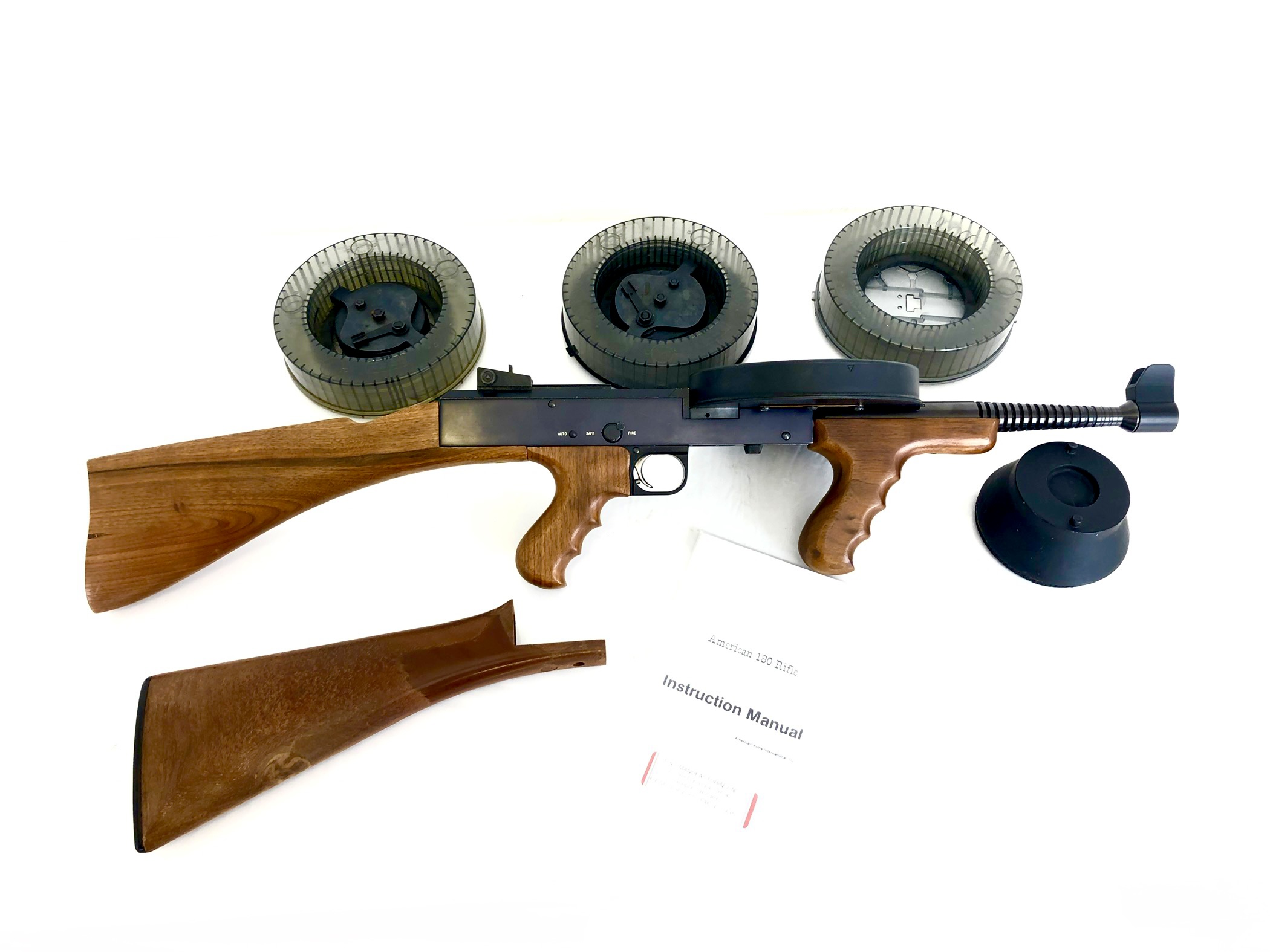 This original factory-made and registered transferable machine gun was built by American Arms International. This particular model is referred to as their “Deluxe” version, noted by the beautiful upgraded walnut hardwood stock, pistol grip, and Thompson-style foregrip, instead of the typically more common Bakelite-style plastic furniture. This model features the 14″ barrel. It will come with its original 177 round metal pan magazine and winder, as well as three additional higher capacity E&L Manufacturing Lexan magazines, two additional magazine winders, magazine loading stand, original manual, and an extra, replacement Bakelite-style stock.