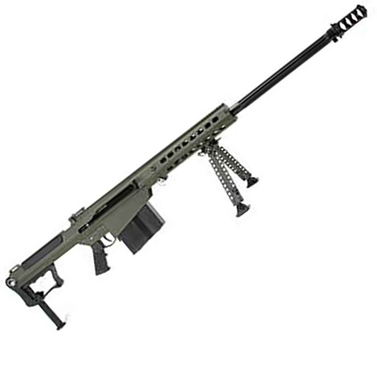 Barrett M107A1 OD Green Cerakote Bolt Action Rifle – 50 BMG – 29in – Designed to be used with a suppressor, this one-of-a-kind rifle allows you to combine signature reduction capabilities with the flawless reliability of the original Barrett M107, but with a rifle weight reduction of 5 pounds. An all new bolt carrier group has been designed and is key to making the rifle suppressor ready. Its steel four port cylindrical muzzle brake is engineered to work seamlessly with a quick attach Barrett QDL Suppressor. The lightweight aluminum upper receiver features an integrated 27 MOA optics rail. Inside the upper receiver, the bolt carrier rides on a hardened steel anti wear strip for added durability. A thermal-guard cheek piece protects the user’s face from extreme heat or cold. The rear barrel stop and front barrel bushing are bolted and bonded with a high strength compound. A titanium barrel key and fully-chrome-lined bore and chamber add to the rifle’s durability. The newly designed titanium and polymer monopod is adjustable from either side. The M107A1 rifle’s lower receiver includes an aluminum recoil buffer system that’s optimized for use with the Barrett QDL Suppressor. The bolt carrier’s components are protected with a mix of ultra hard coatings and advanced nickel Teflon plating that increases lubricity, is corrosion resistant and greatly eases cleaning. Numbered witness holes on the magazine are just another example of how even the smallest detail makes a powerful difference.
