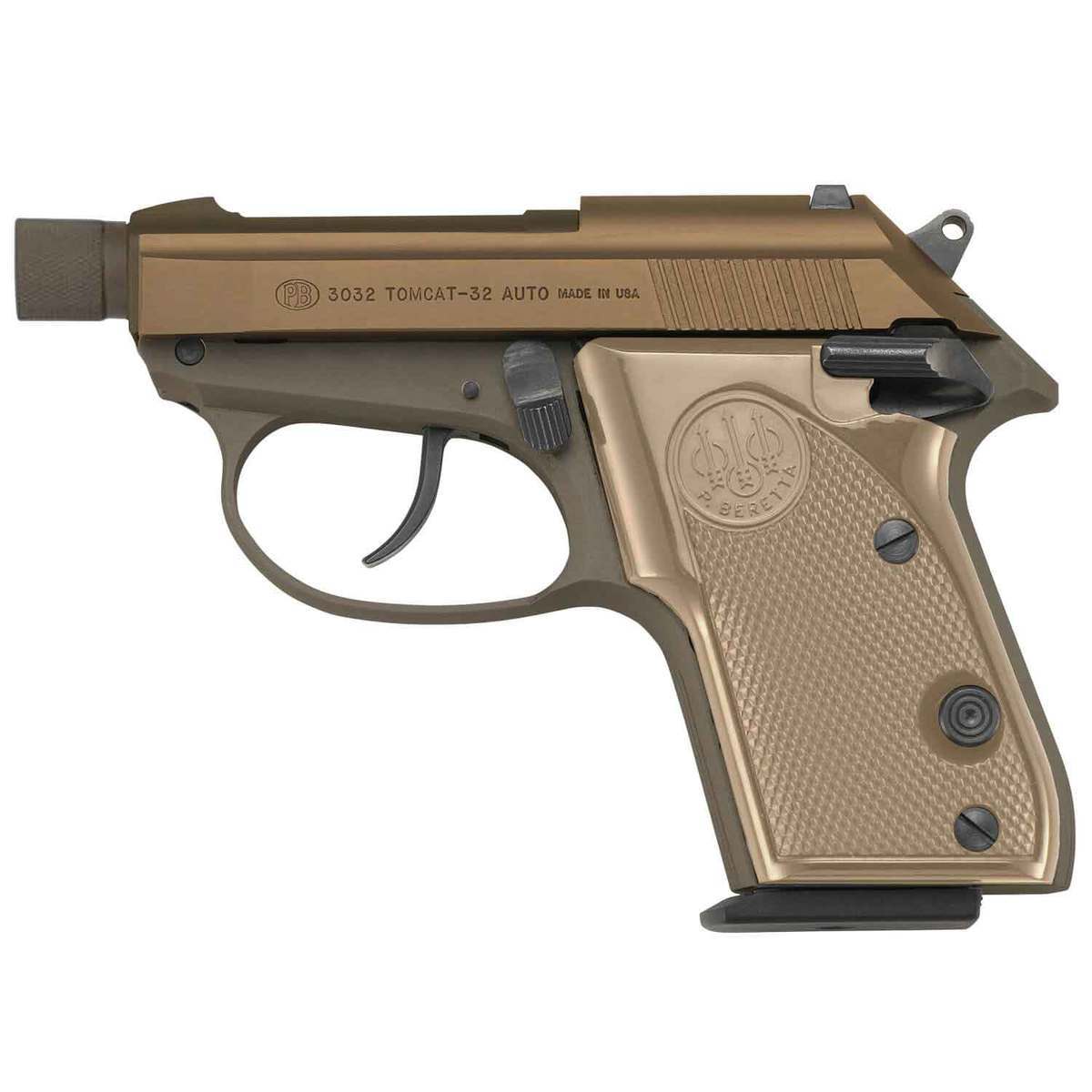 Beretta Tomcat FDE 32 Auto (ACP) 2.9in FDE Pistol – 7+1 Rounds – Beretta’s 3032 Tomcat with a tip-up barrel design that allows the user to load chamber without slide retraction. The Covert model includes a factory threaded barrel with a thread cap, 1/2×28 thread suppressor intended for use with a .22 Caliber projectile. Flat Dark Earth Finished Slide And Barrel Flat Dark Earth Polymer Grips Fixed Low-Profile Sights Aluminum Frame Single/Double Action