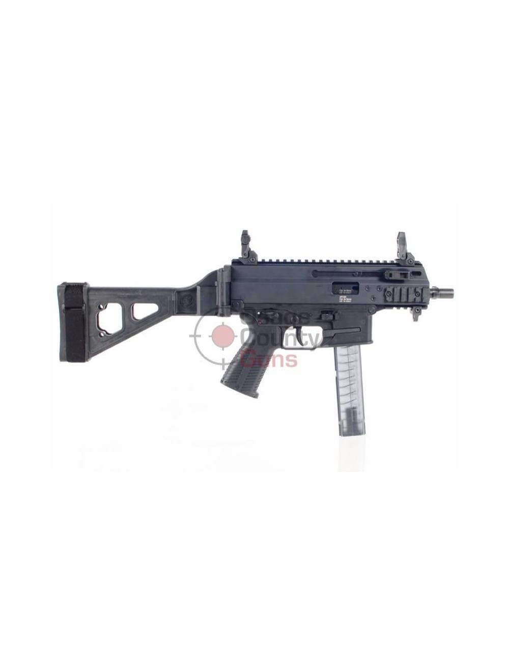 This is the new B&T (Brügger & Thomet) APC9K Pro. The APC9 is a closed bolt semi-automatic pistol and ships in a hard case with one 30-Round magazine. Barrel length is 4.3 inches and also includes a tri-lug adapter. With the tri-lug adapter installed barrel length is 5.4 inches. A B&T Side-Folding brace is included.