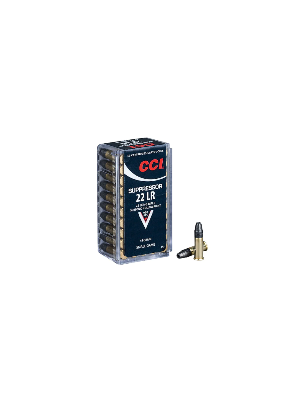 Whisper-quiet. Deadly as ever. CCI Suppressor is optimized for use in suppressed firearms. Its subsonic velocity further reduces noise, yet the hollow-point bullet expands reliably for excellent terminal performance. Clean-burning powders minimize blow-back and ease firearm cleaning.