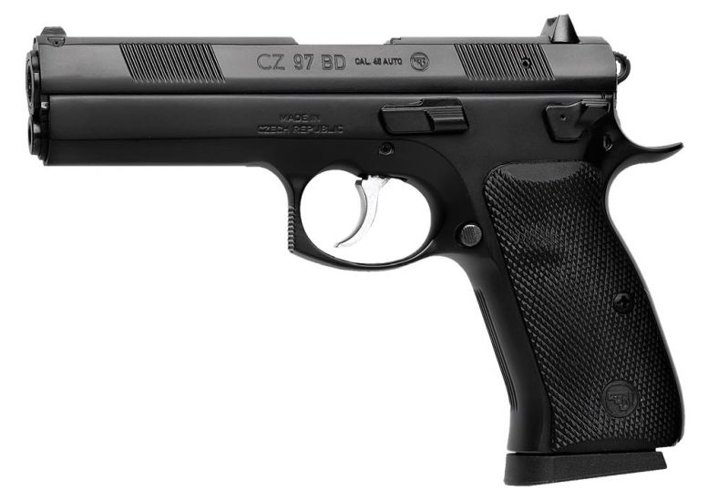 Caliber: .45 ACP – Magazine Capacity: 10 – Magazine Type: Staggered – Frame: Steel – Grips: Thin Aluminum – Trigger Mech: DA/SA – Sights: Fixed Tritium – Barrel: Cold Hammer Forged – Barrel Length: 4.800 in – Weight: 2.540 lbs – Overall Length: 8.300 in – Height: 5.900 in – Width: 1.400 in – Safety: Decocking Lever – Safety Stop on Hammer Firing Pin Block Safety Loaded Chamber Indicator – A decocker version of the basic CZ 97 B model we added tritium night sights to make it usable in low-light situations. The decocking lever is mounted on the left side allowing the hammer to be lowered on a loaded chamber and enable safe