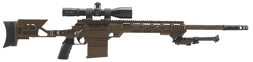 Modern modular and multi-caliber the Ballista represents the future of precision rifle systems. Designed to deliver surgically precise fire the rifle can be configured in less than two minutes to any of three available chamberings (.338 Lapua Mag. .300 Win. Mag. and .308 Win.). Featuring repeatable accuracy with all chamberings the Ballista employs a high strength vibration-isolated aluminum alloy receiver with a top mounted MIL-STD 1913 rail. In addition the rifle features multiple rail segments for the addition of accessories. Fluted barrels measure 26-inches and the bores have polygonal rifling with a right-hand constant twist rate. A fully adjustable trigger (for single or two-stage release between 3 and 5 pounds) and adaptable ambidextrous folding stock allow the shooter to configure the rifle for enhanced performance. For those who want the future of precision rifle performance today look no further than the Ballista multi-caliber system. – Caliber: .338 Lapua Mag. (conversion kits available in .300 Win. Mag. and .308 Win.) – Barrel: 26 – Operation: Bolt-action – Overall Length: 50.75 (extended); 49.5 (collapsed); 39 (folded) – Height: 7.8 – Weight: 15.1 lbs. (empty) – Magazine: 5 or 8 rds. (.338 Lapua Mag.); 6 or 10 rds. (.300 Win. Mag.); 8 or 15 rds. (.308 Win.)