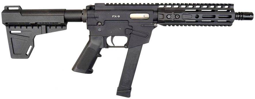The FX-9 pistol (Freedom Xtreme) has a familiar set of operating controls for the avid AR-15 user, it accepts AR-15 stocks and buffer tube assemblies, as well as most free-float AR-15 rail assemblies. The FX-9 is machined from billet material, anodized type III aluminum components, and full hard nitride steel components including the barrel, bolt, ejector, last round hold open, feed ramp, and extractor for extended wear properties and corrosion resistance. The upper and lower receiver are more than 1 shorter than a standard AR-15, making it more compact and lighter. The FX-9 uses standard, double-stack Glock-style 9mm magazines. This model features a 7.375 free-floating M-Lok rail, 8.25 barrel, KAK stabilizing arm brace, and comes with a 33-round magazine.