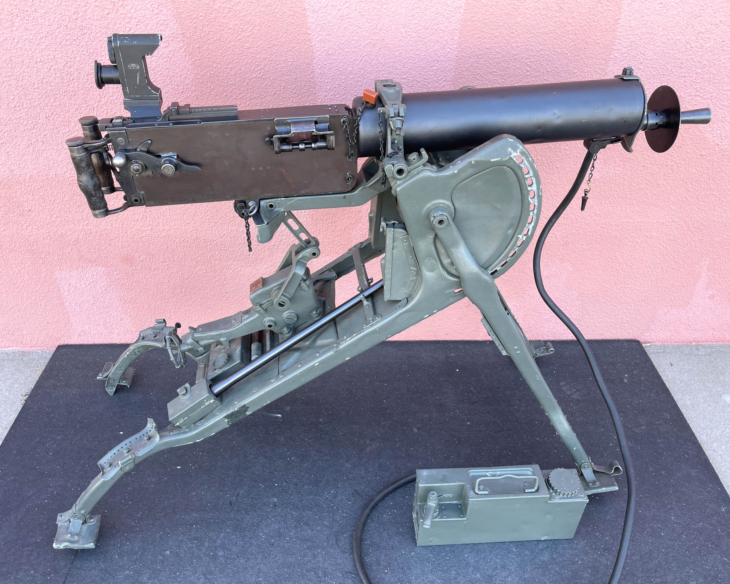 MG 08 Maxim manufactured by Gwf SPANDAU in 1917, completed with Craig Carroll side plate – extremely well done. This early Maxim saw serious action and has water jacket repairs. It is in very good condition. Comes with original German sled mount dated 1916 and three pieces of the armor system: the Sled Mount Inner Armor Shield, the Front Surface and full length water jacket armor (it is unknown if the armor is original or reproduction). The sled mount has all of the accessories: an extra Maxim barrel with excellent bore, two extra Maxim locks, cartridge retrieval tongs, broken shell extractor, and chamber clearing tool. It also includes a muzzle gland for the MG08 barrel, which allows the machinegun to shoot at a slower cyclic rate that when using the Muzzle gland/booster assembly with flash hider, also included. The serial numbers of all of the main components of this machinegun match: the water jacket, top cover, left side plate, fusee spring cover, even the two lubricant container/brushes that screw into the top of the spade grips have serial numbers matching the machinegun. Also includes original WWI ZF-12 Maxim scope with excellent optics, in original case. Uses readily available 8mm Mauser ammunition and comes with one easy to hand-load 8mm WWI Schwarzlose belt that works better in the Maxims than the original cloth belts. Includes Combination Hammer/Spanner wrench, steam hose and 1916 Water Chest with spout. Fully transferable. $24,500