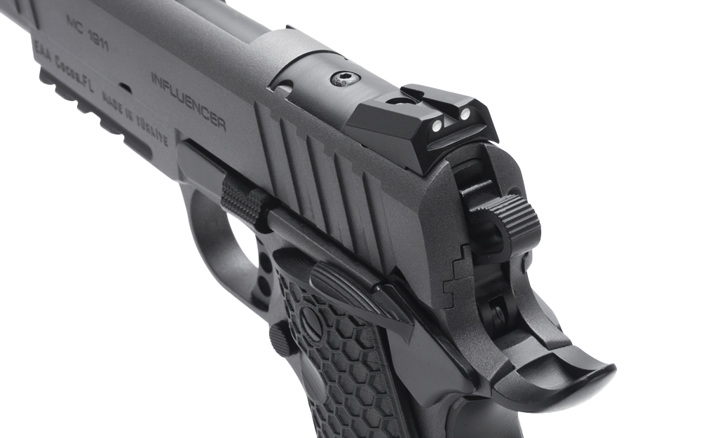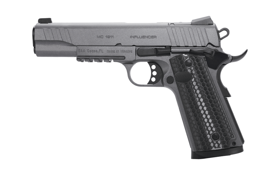 The MC1911 Influencer series offers a premium tactical 1911 at an affordable price ideal for both target shooting and defensive use. The pistol features an optic ready slide designed for direct mounting of RMS and RMSc style optics along with an accessory rail for mounting lights and laser aiming devices. The addition of hexagon-style grips and an extended beavertail and magazine well allows for maximum comfort and ease of use. The Influencer series also features an ambidextrous safety lever to accommodate both right and left-handed shooters.