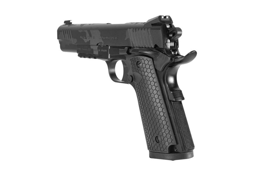 The Untouchable series of the MC1911 offers a premium classic-style tactical 1911 pistol at an affordable price that is ideal for target shooting or defensive use. The pistol features hexagon-texture grips with a 7-pattern slide serration cut and 3-dot iron sights. An ambidextrous safety lever allows for easy use by both right and left-handed shooters.