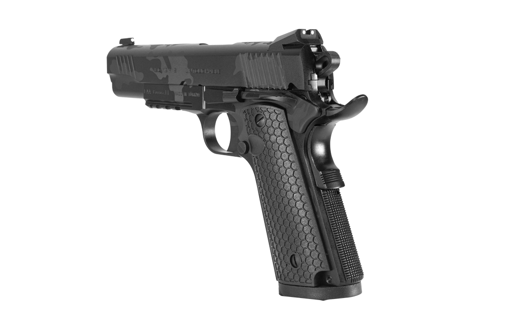This model is the S variant that features a full-size frame and barrel. It features a black camouflage color pattern and includes one 8-round magazine.