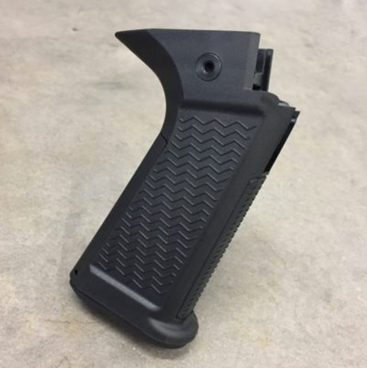 Replacement pistol grip for the CZ Scorpion designed by Yeti Wurks (Gen 3). This grip is injection molded polymer and features a more vertical angle over the factory grip, allowing the user to tuck their elbow in for a more compact stance when operating the weapon. The aggressive texturing and two interchangeable backstraps (large and small) allow the user to dial in the ergonomics even further. Grips are hollow and come complete with a base plug that allows the grip body itself to be utilized as a storage compartment.