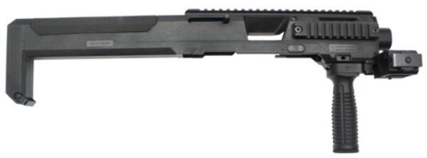 The Glock Carbine Stock conversion is a unique shaft system is for Glock pistol models 17, 19, 22, 23, 31, 32: A simple assembly through utilization of the available front Picatinny rail as well as the included front rail locking bolt. Included is an ambidextrous charging handle which gives the possibility of assembly to both right and left handed shooters The G.C.C. has a super ergonomic design and allows the possibility to mount a front fore-grip, lamps, lasers and iron sights to the additional Picatinny rails. All models come with a cheek rest that is made of a high quality neoprene rubber for extra comfort.
