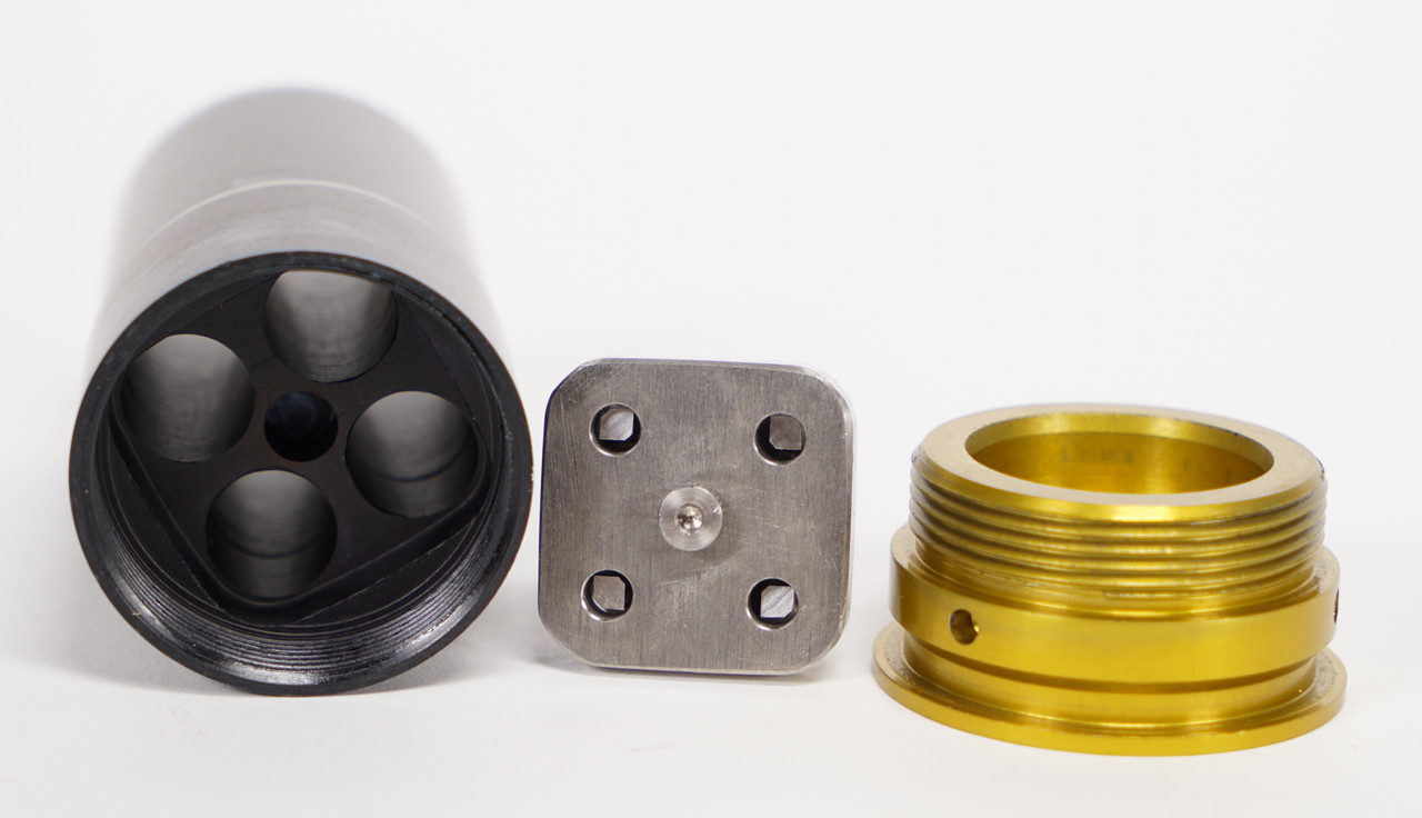 The new, improved design incorporates a replaceable primer pocket by using a cut down .45 ACP brass casing. It is installed with a press-fit.