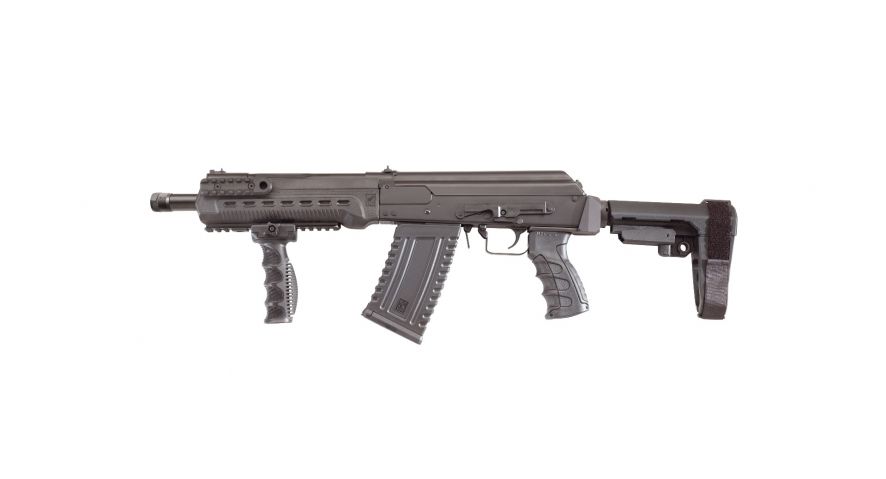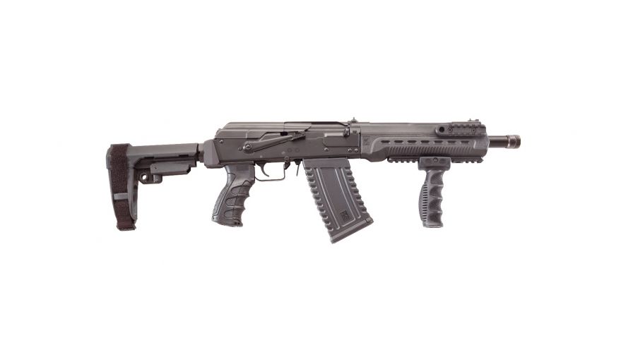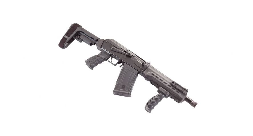 The Komrad™ is a US manufactured 12 GA semi-automatic tactical short barreled firearm based on the Russian Saiga series. It is designed to accept 2.75” and 3” shells and includes two 5 round magazines. The Komrad™ has a SB Tactical SBA3 pistol brace, adjustable pistol grip, tri-rail forend, vertical forward grip, standard side mounted optics rail and a threaded muzzle nut. Total length of the firearms comes to 31.5”. Most of the currently available Saiga accessories will work on the Komrad™ including magazines and drums.