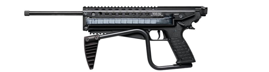R50 stands for Rifle – 50 Rounds in complementing contrast to the P50, the pistol version of the same platform. This carbine features a side-folding stock that rests nicely on either side of the grip when folded and a ½ x 28 threaded – 16 inch barrel. It does come with some utility sights that are adjustable for windage and elevation, however the R50 receiver offers over 7 inches of picatinny rail space up top for mounting just about any optic or accessory you like. 2 inches of rail space on the bottom is ideal for light and grip options. There’s a QD sling cup just above the magazine release for mounting a single point sling and the AR style charging handle offers smooth manipulation.
