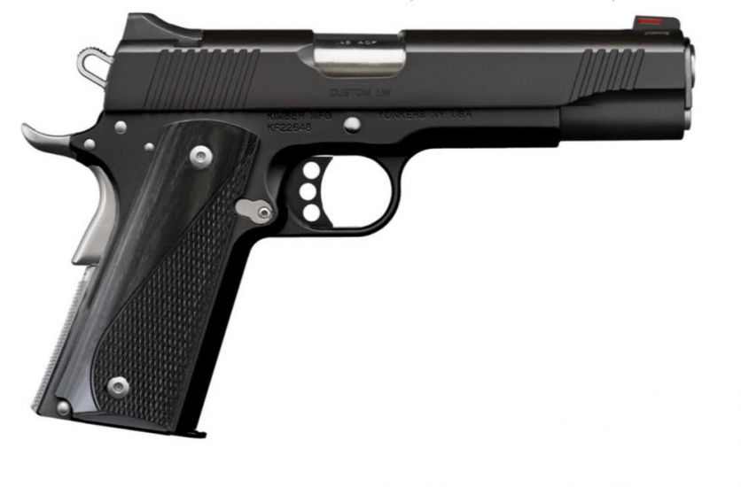 The Kimber 1911 Custom LW (NightStar) 9mm handgun is built on a lightweight aluminum frame and features a blacked out finish with stainless steel small parts. The checkered grips are made from gray laminate and the slide is outfitted with a white dot rear sight and a fiber optic front sight.