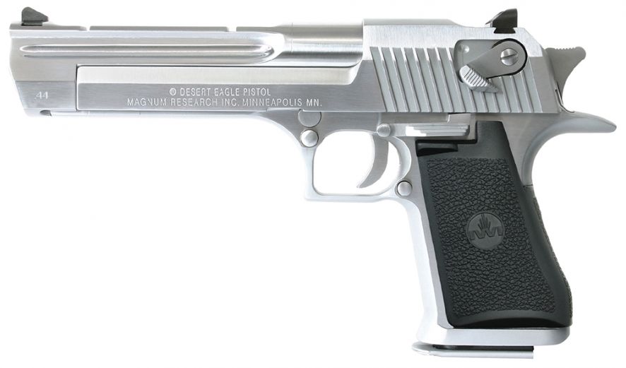 This US-manufactured Desert Eagle .44 Magnum is a gas-operated, semi-automatic pistol with a rotating bolt for positive lock-up. The barrel is locked in place, assuring a high degree of accuracy. Maximum effective range with the standard 6 barrel is 200 meters (650 ft). The polygonal rifling reduces barrel wear and enhances the obturation between the bullet and the bore, thus increasing accuracy. It has an anatomically formed grip, for an ideal hand seating angle and comfortable grip dimensions to permit rapid, accurate, instinctive shooting. The Desert Eagle is designed for two-handed shooting. When the last round in the magazine is fired, the slide remains in its maximum recoil position, permitting rapid change of magazine and immediate chambering of a round for instant resumption of firing. This model has two mounting slots on the top of the slide for the use of aftermarket optics. This model is California compliant.