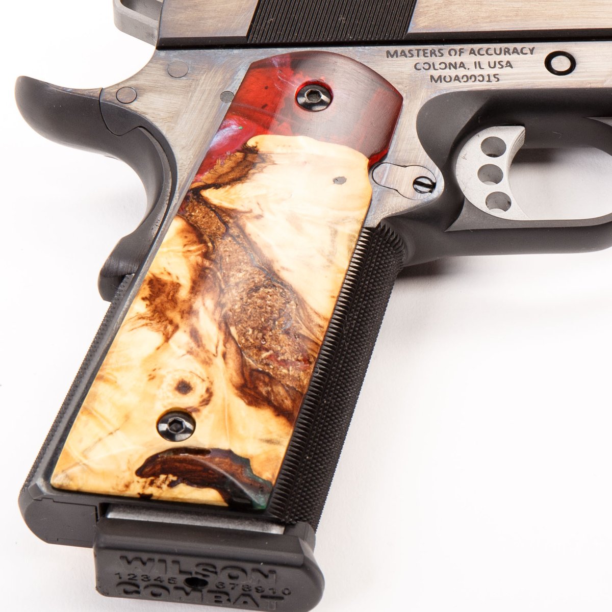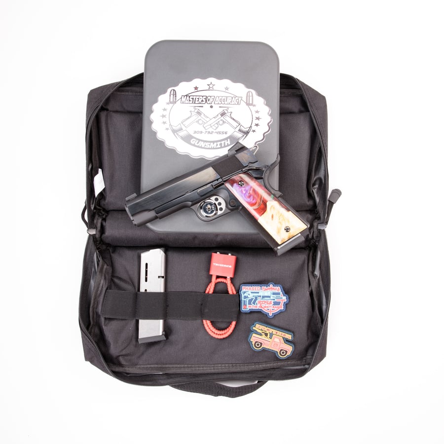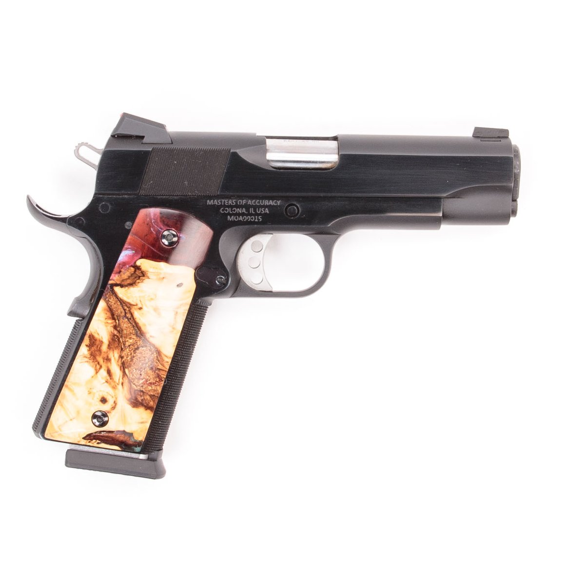 This pistol was made exclusively for Guns.com and features Masters of Accuracy’s in-house blued finish and comes with fiber optic Novak sights. The grips have been manufactured in-house by hand from epoxy resin and maple burl wood. Two 8-round Wilson Combat magazines are included along with a soft carrying case. This pistol has been test fired by the manufacturer using over 200 rounds of various FMJ and JHP 230 gr ammunition to ensure function, reliability and accuracy before shipping.