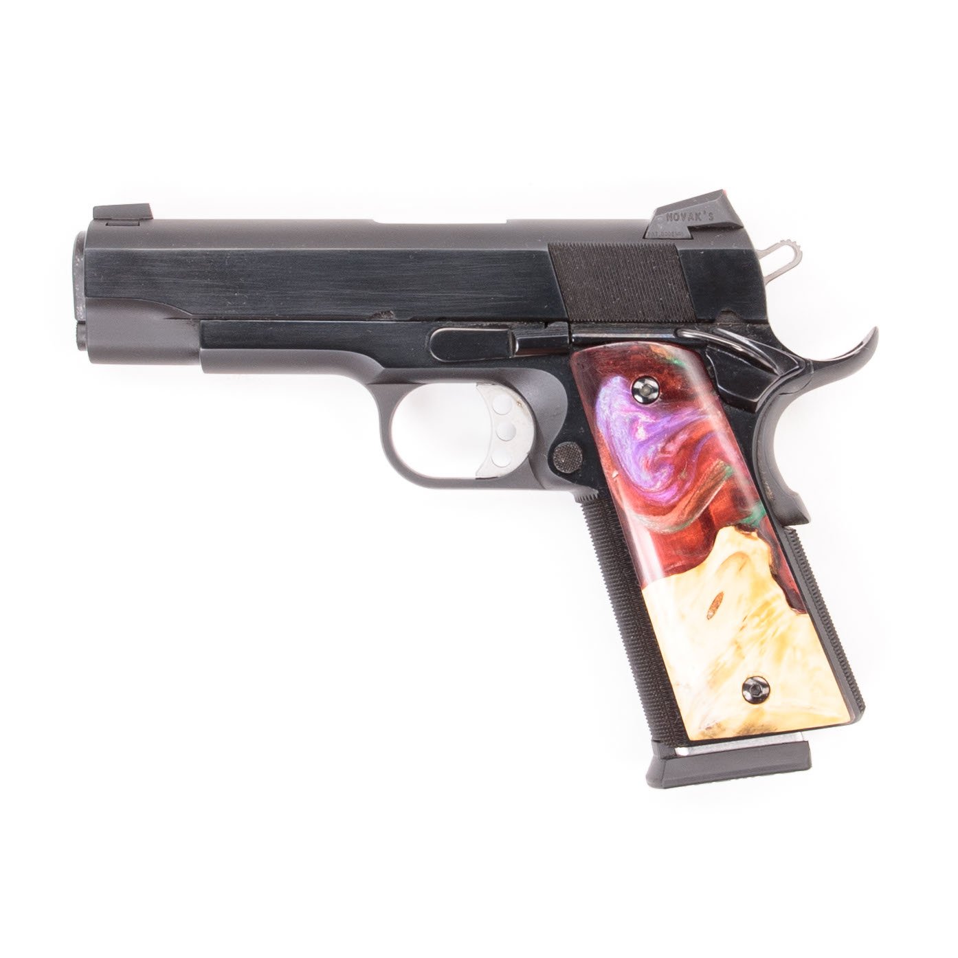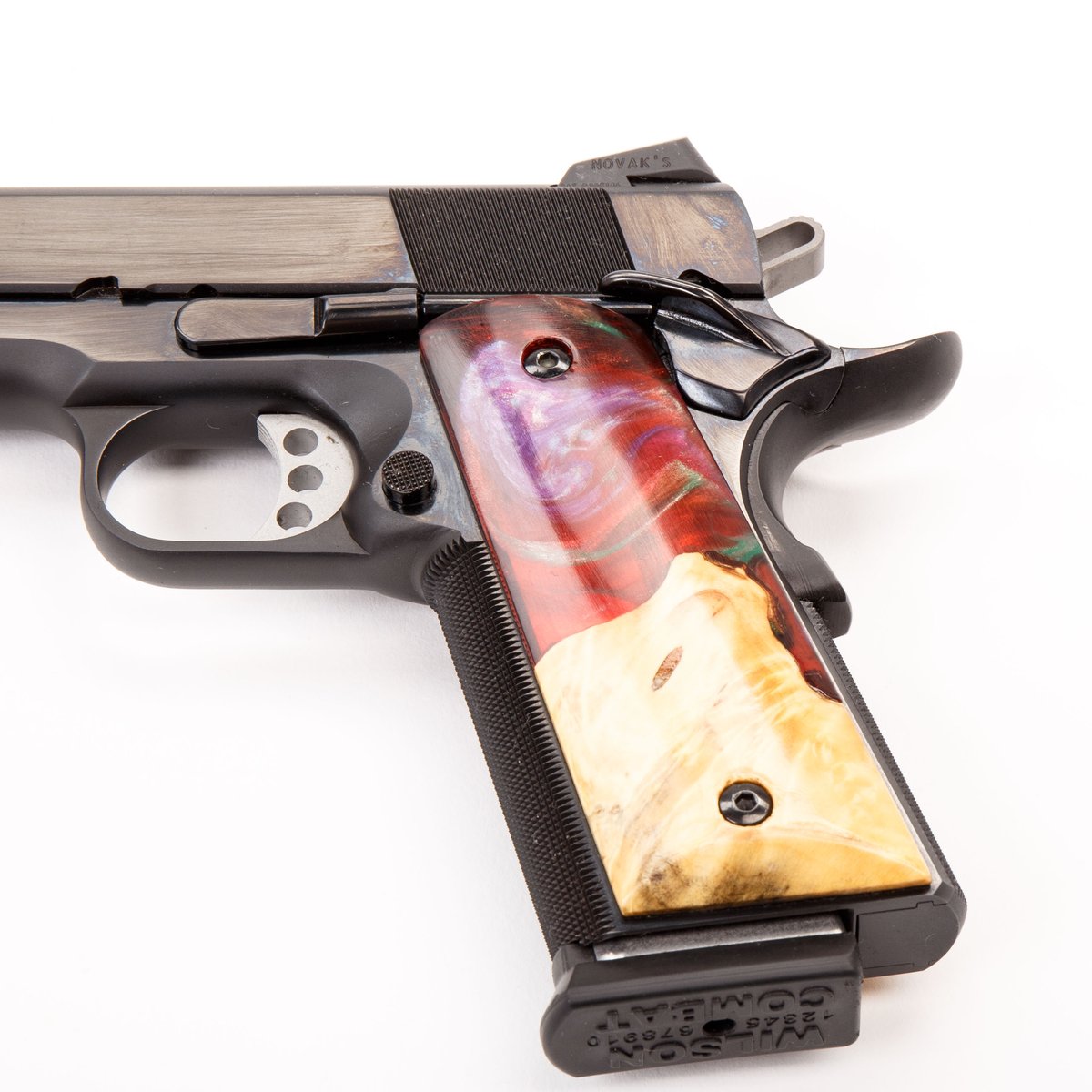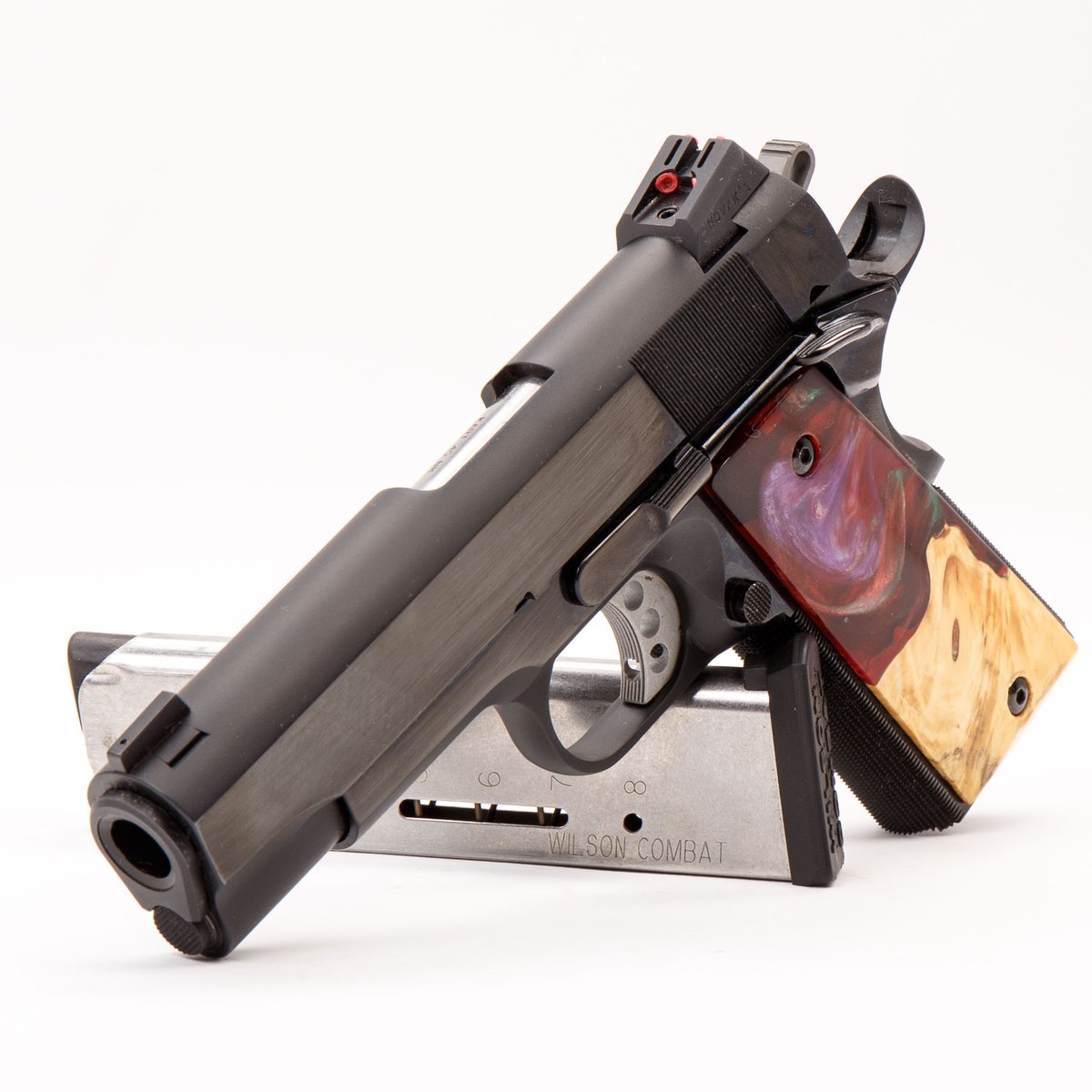 This pistol was made exclusively for Guns.com and features Masters of Accuracy’s in-house blued finish and comes with fiber optic Novak sights. The grips have been manufactured in-house by hand from epoxy resin and maple burl wood. Two 8-round Wilson Combat magazines are included along with a soft carrying case. This pistol has been test fired by the manufacturer using over 200 rounds of various FMJ and JHP 230 gr ammunition to ensure function, reliability and accuracy before shipping.