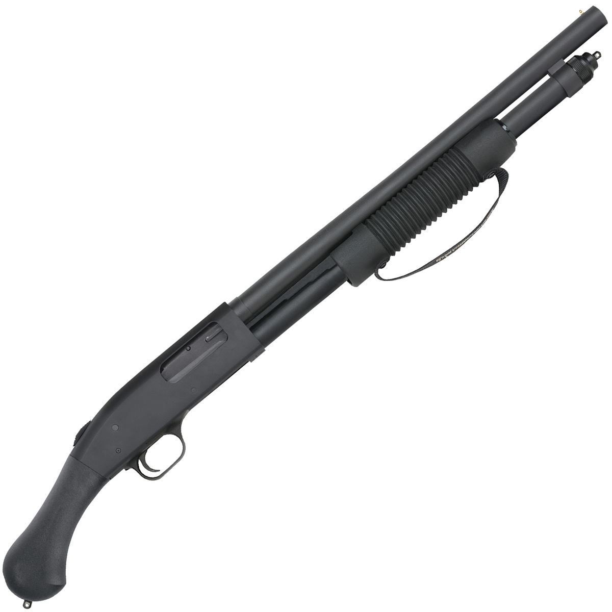 Mossberg 590 Shockwave 7-Shot Black 12ga 3in Pump Firearm – 18.5in – The 590 Shockwave Raptor bird’s head pistol grip is uniquely shaped to minimize felt recoil. The 590 Shockwave features a convenient clean-out tube magazine cap, a front bead sight, and ‘corn cob’ strapped forend to keep shooter’s lead hand clear of the muzzle. This model has a 18.5in heavy-walled barrel with a cylinder bore, a blued metal finish, and a 7 shot capacity. Learn more about the Mossberg 590 Shockwave. Bead Front Sights 7-Shot Clean Out Tube Corncob Forend With Strap