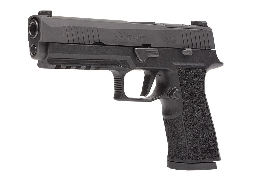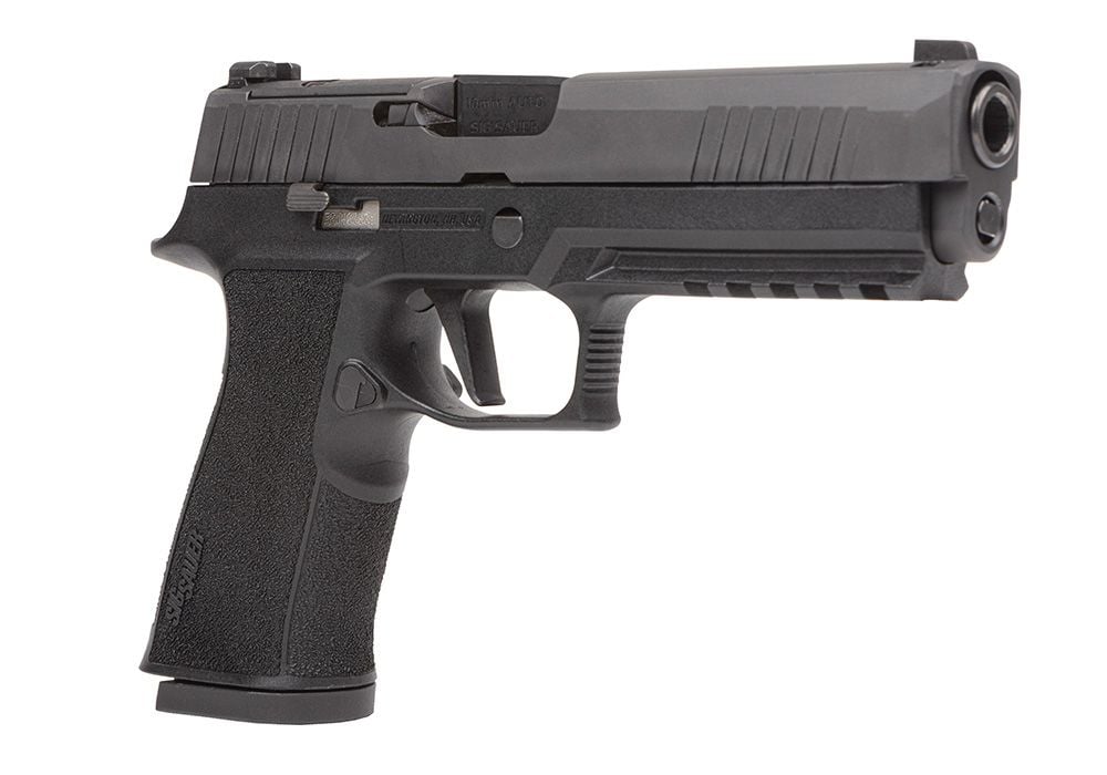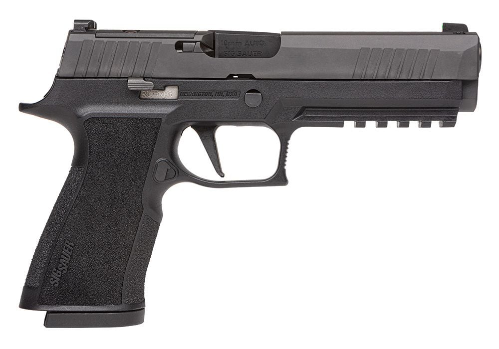 The Sig P320 XTen features an optic ready slide compatible with Romeo2 and Trijicon RMR. It also utilizes X-Series 10mm/45 Auto grip module, bull barrel, flat X-Series trigger & XRAY3 day/night sights.