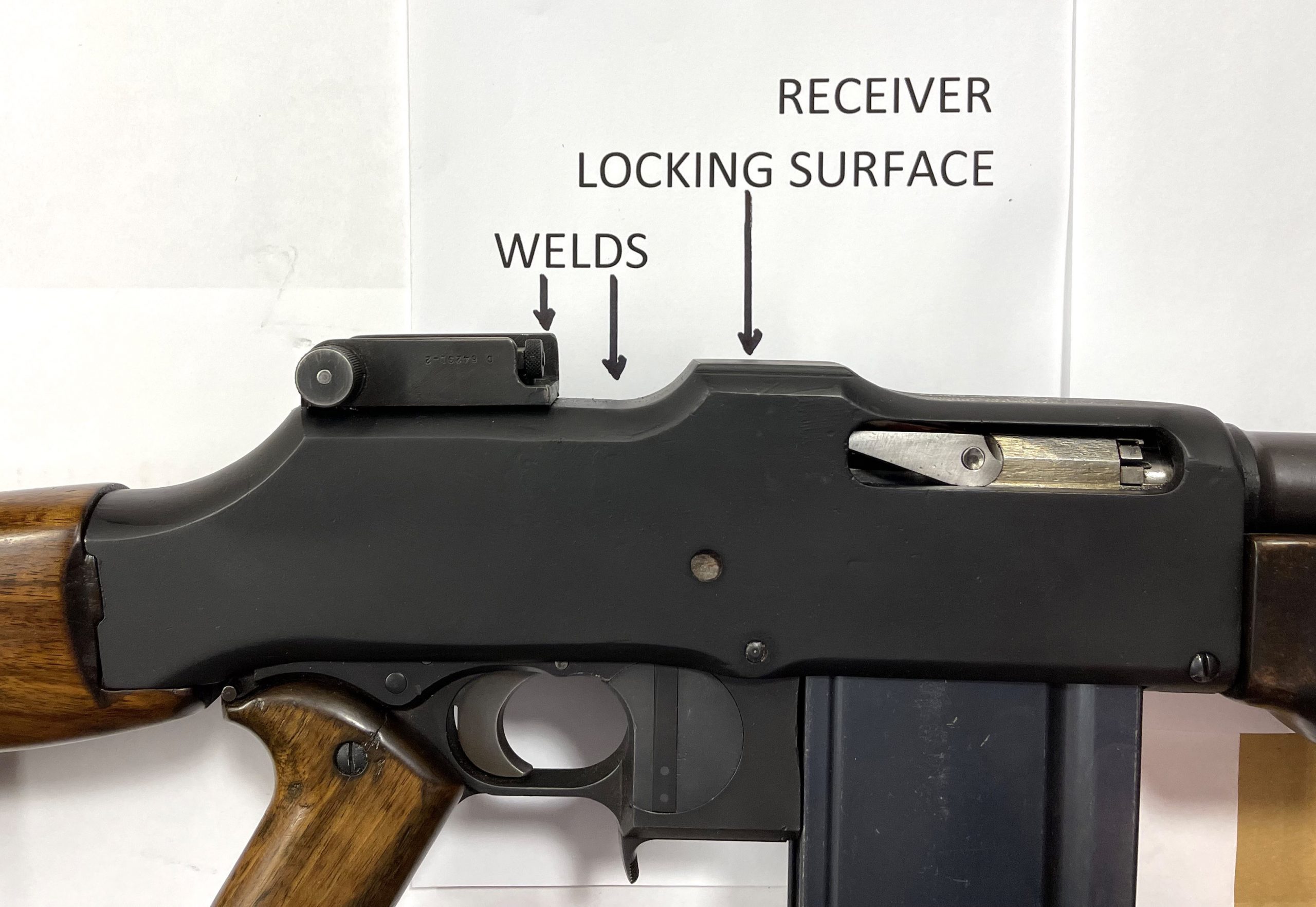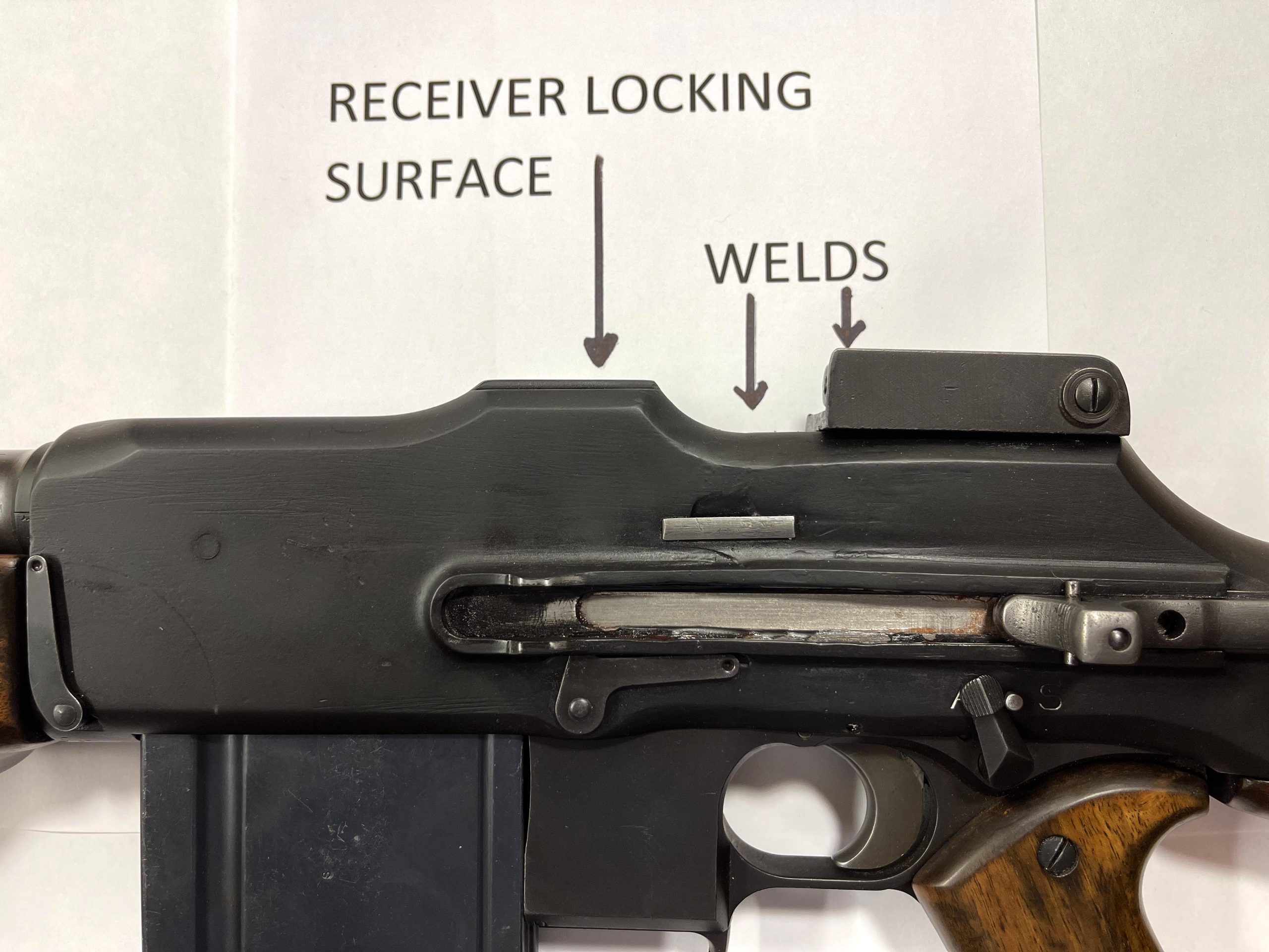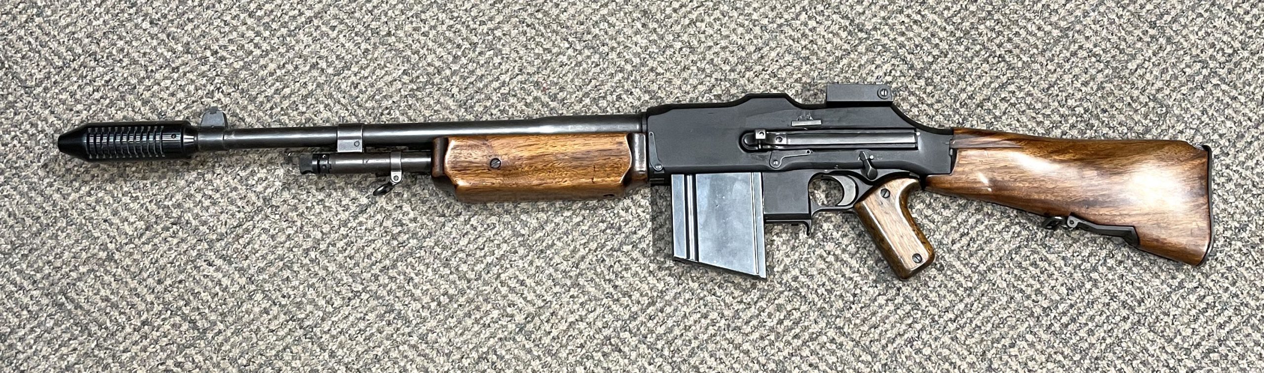 This BAR was originally a Marlin Rockwell 1918 Browning Automatic Rifle, later updated to a 1918A2 and so marked on the receiver. Before 1968, the rear tail of the receiver was cut off, leaving the operational portion of the receiver intact. This piece, from the forward edge of the receiver at the barrel threads, to a point behind the Locking Shoulder of the receiver, was not cut and remained a single piece. When a BAR is fired, the Bolt Locking Surface is positioned in the Locking Recess, fully-against the Receiver’s Locking Shoulder, fully-locking the action, to handle the powerful 30-06 cartridges. The piece of the receiver tail that was cut off, does not contribute to the locked strength of the receiver, but does support the bolt in its rearward movement after each shot. The cut edge of the receiver was squared off and two receiver pieces were fit and welded to it, to reconstruct the BAR receiver. Yes, this BAR receiver is not as desirable as an untouched, transferable WWI example, but this POOR MAN’S MONITOR would be more costly if it was based on an untouched receiver. Plus, THIS REWELDED, BARRELED, BAR RECEIVER WAS REGISTERED IN THE 1968 AMNESTY: MODEL 1918A2 BAR MANUFACTURED BY MARLIN ROCKWELL. Examine the many photographs. The barrel was shortened to 18 inches and has excellent rifling. The CUTTS Monitor Compensator was obtained from Kent Lomont, who contracted with an engineering firm to reproduce six beautiful examples. The pistol grip lower receiver is from a Fabrique Nacional BAR. It shoots only is full-auto. The cyclic rate of the BAR is about 500 rounds per minute, slow enough to easily fire multiple bursts from a single 20 round magazine. The magazines need to be either FN BAR 30-06 magazines, or US BAR magazines with the FN magazine catch notch added. See the magazine photo to best visualize this. Three magazines come with this BAR. This BAR functions well and is a unique experience to shoot. The Colt Monitor was a significant improvement for the BAR; the FBI recognized it and obtained most Colt’s production run as soon as they were produced. The photographs show the exterior surfaces of the where the welds are, and interior views of the welded areas. The receiver is finished in black Cerakote. $39,500, Fully-transferable. Transfers to your dealer promptly by eForms. For questions or to purchase this POOR MAN’S MONITOR, call (575) 405-0911 or email [email protected]. Will consider older machineguns, even if not functioning properly, as long as they are properly registered, and older COLT firearms in exchange. Thank you!