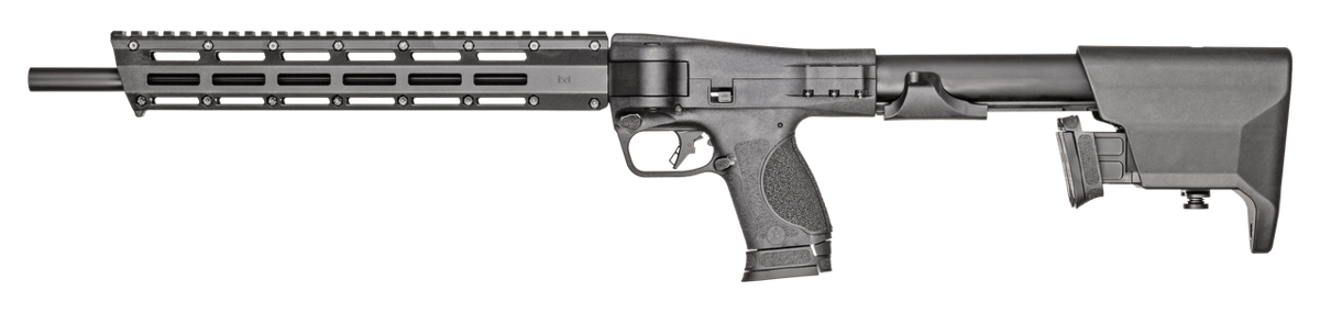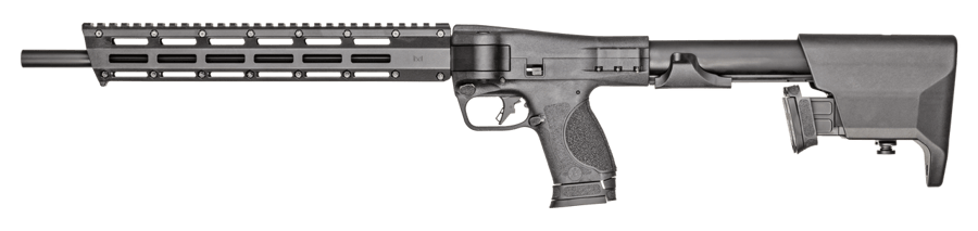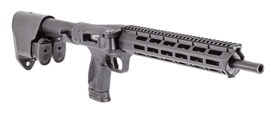 S&W M&P FPC is compatible with M&P Pistol double-stack magazines. The gun features integrated recoil buffer system; reversible magazine catch; threaded muzzle with thread protector; in-stock magazine storage w/quick-release tab system; horizontal folding mechanism with locking latch, design doesn’t interfere with top-mounted optics and charging slide/handle doubles as retainer when folded. Includes carrying bag with additional storage and Velcro straps; four interchangeable palmswell grip adapters, three 10 round mags