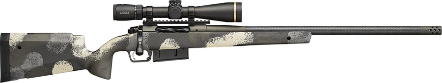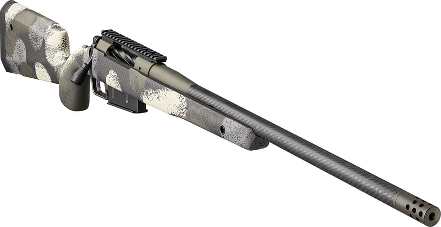 This model is chambered in 7mm Precision Rifle Cartridge (PRC) and features a 24-inch carbon fiber barrel and an Evergreen Camo stock color pattern. One 3-round Accumag magazine is included along with a soft rifle case.