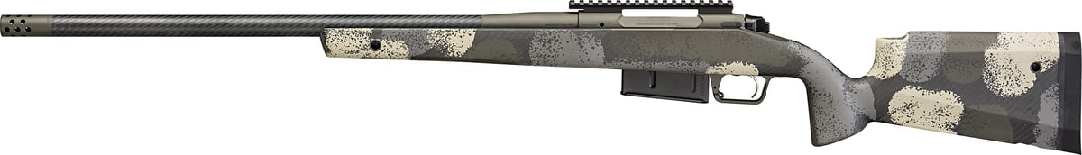This model is chambered in 7mm Precision Rifle Cartridge (PRC) and features a 24-inch carbon fiber barrel and an Evergreen Camo stock color pattern. One 3-round Accumag magazine is included along with a soft rifle case.