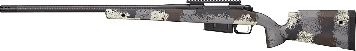 This model is chambered in 7mm Precision Rifle Cartridge (PRC) and features a 24-inch carbon fiber barrel and an Evergreen Camo stock color pattern. One 3-round Accumag magazine is included along with a soft rifle case.