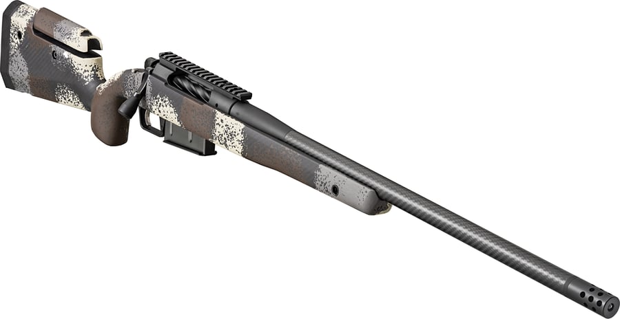 This model is chambered in .300 Precision Rifle Cartridge and features a 24-inch carbon fiber barrel and an Ridgeline Camo stock color pattern. The stock features an adjustable cheek riser for custom fit. One 3-round Accumag magazine is included along with a soft case.