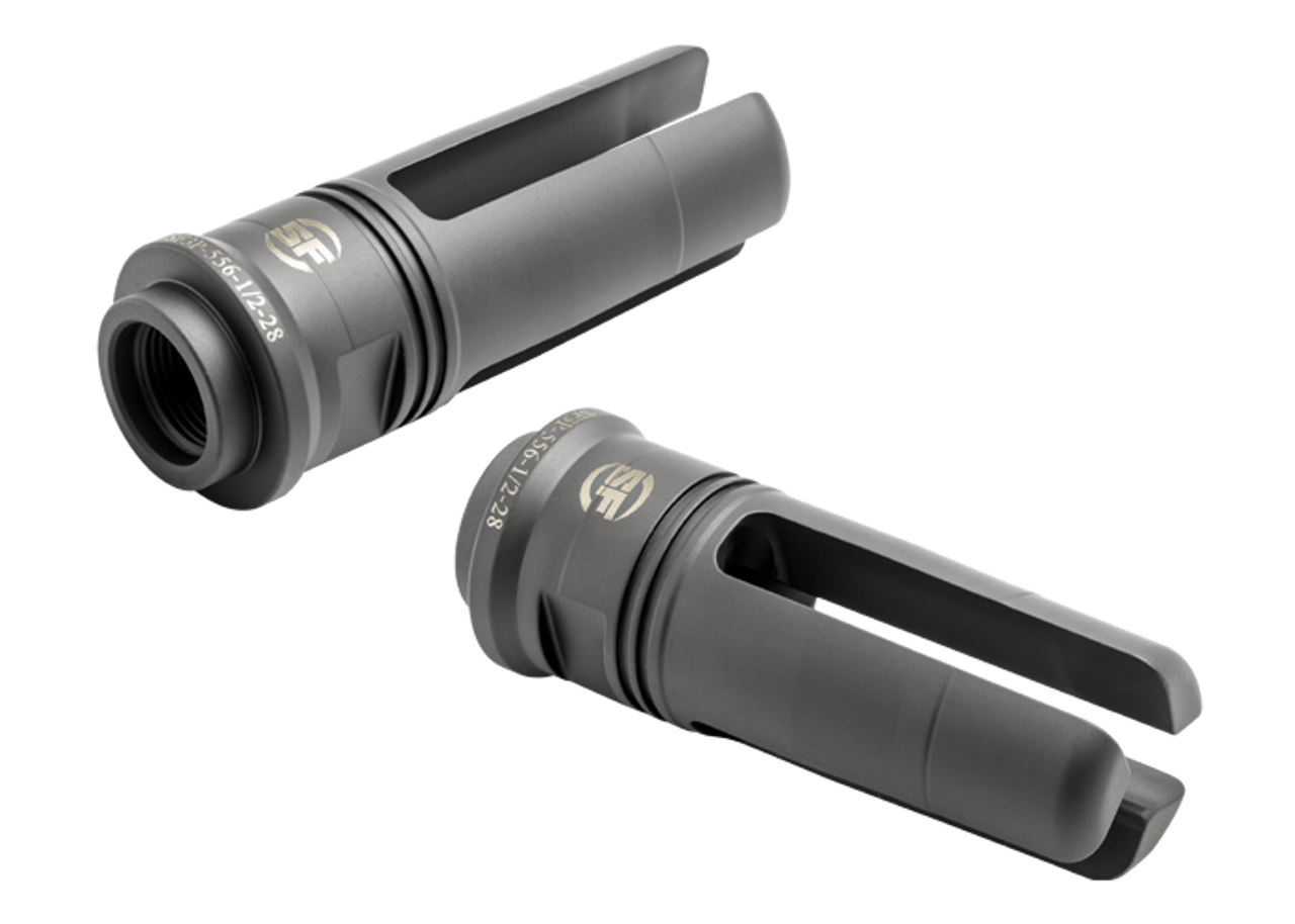 The advanced SureFire SF3P-556-1/2-28 three-prong flash hider, which fits M4/M16 weapons and variants with 1/2×28 muzzle threads, features a patent-pending design that greatly reduces muzzle flash—typically greater than 99%—when compared with a plain muzzle. Boasting robust tines built to withstand the rigors of combat, the SF3P-556-1/2-28 also serves as a rock-solid mounting adapter for SureFire SOCOM Series 5.56 mm Fast-Attach® suppressors, the SOCOM556-RC model having placed first in the most extensive and rigorous suppressor testing ever conducted by US Special Operations Command.