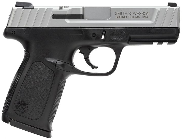 This two tone model has a black frame with a satin finish stainless steel slide and includes a 10-round magazine.
