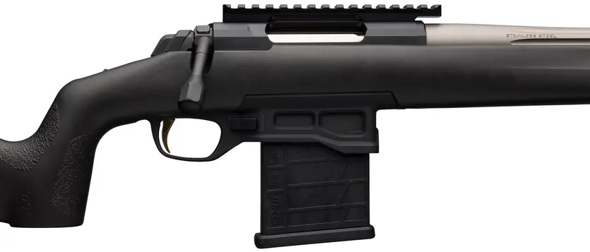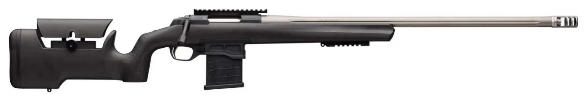 New for 2023 — A new Browning bolt-action rifle optimized for long-range target shooting and competition. Features include a stiffer, heavier receiver, fluted stainless steel barrel with Recoil Hawg muzzle brake on 5/8″-24 suppressor-ready threads, adjustable Target DLX trigger, extended bolt handle and adjustable MAX composite stock.